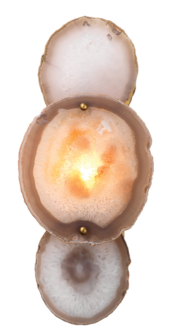 Three unique slices of natural agate stone are individually arranged to create extraordinary pieces of art. Embrace this wall sconce's... Show more