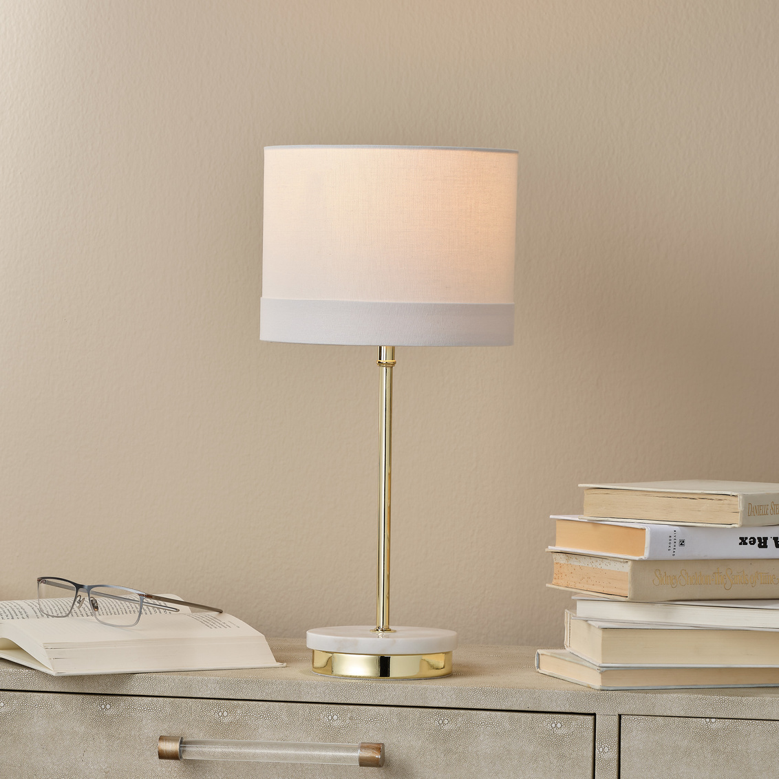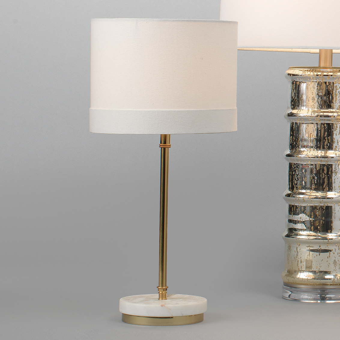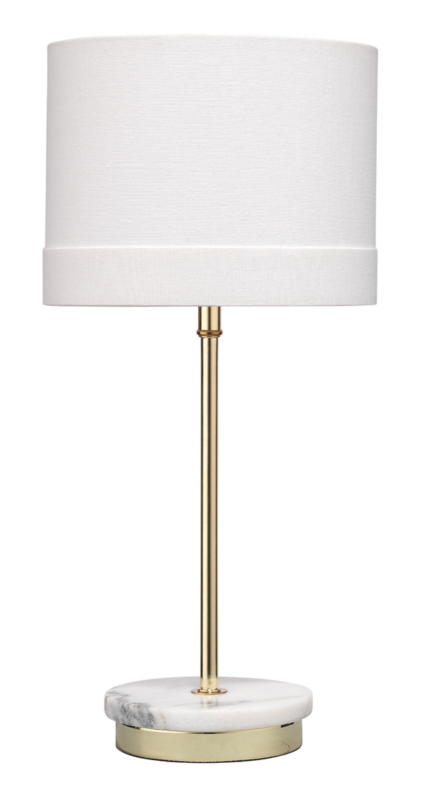 A graceful contemporary lamp with a marble & brass base give it glamour and dimension. Paired with a drum cotton... Show more