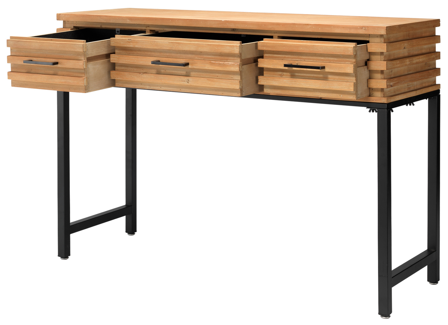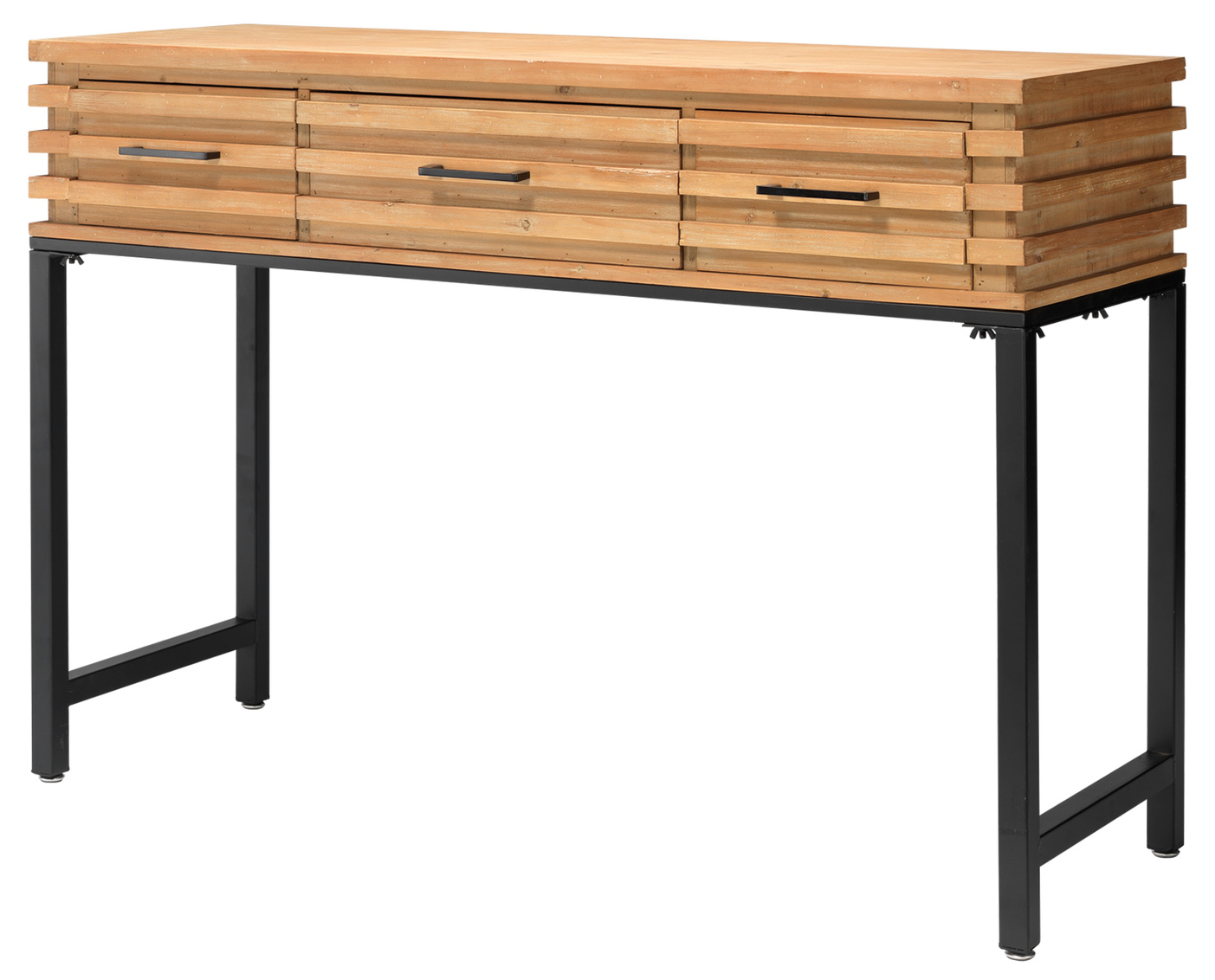 Industrial modern loft style slatted wood console table with black metal base has a rugged no-nonsense simplicity.