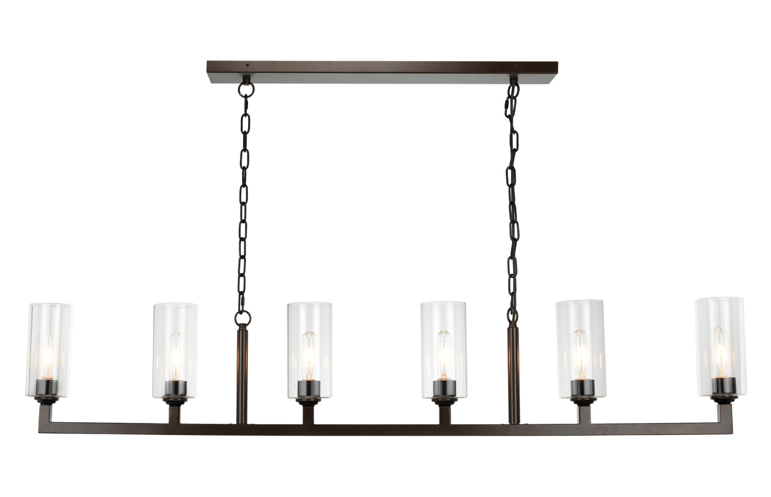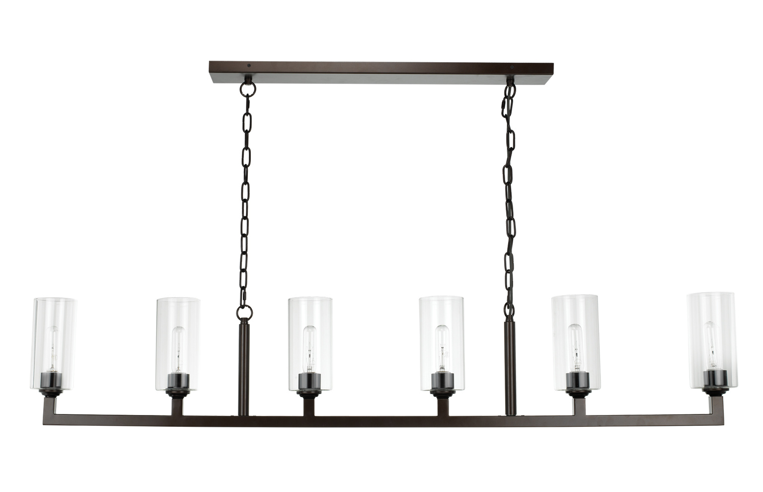 The stylish angles of the Linear 6 Light Chandelier provide a warm illumination that highlights any bar, counter or dining room elegantly. This hanging fixture modernizes the classic vintage torchier with clear glass shades and metallic chain link hardware.
