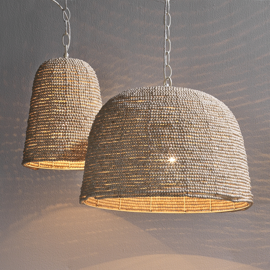 Strings of beads made with mango wood line the body of the oversized Canal Pendant. A cream iron chain compliments the natural tone and texture of this piece. A statement piece with repeating patterns and textures like this can help add interest to any coastal palette.