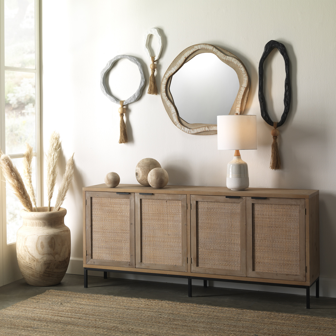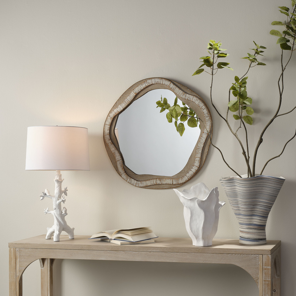 With its organic inspiration evident in both its shape and construction, this attractive wall mirror is handcrafted of wood, and the intriguing embellishments that edge its free-flowing shape are created from sustainably harvested rattan. The piece is finished in a soft palette of cream and beige that allows it to blend easily into most modern decors.