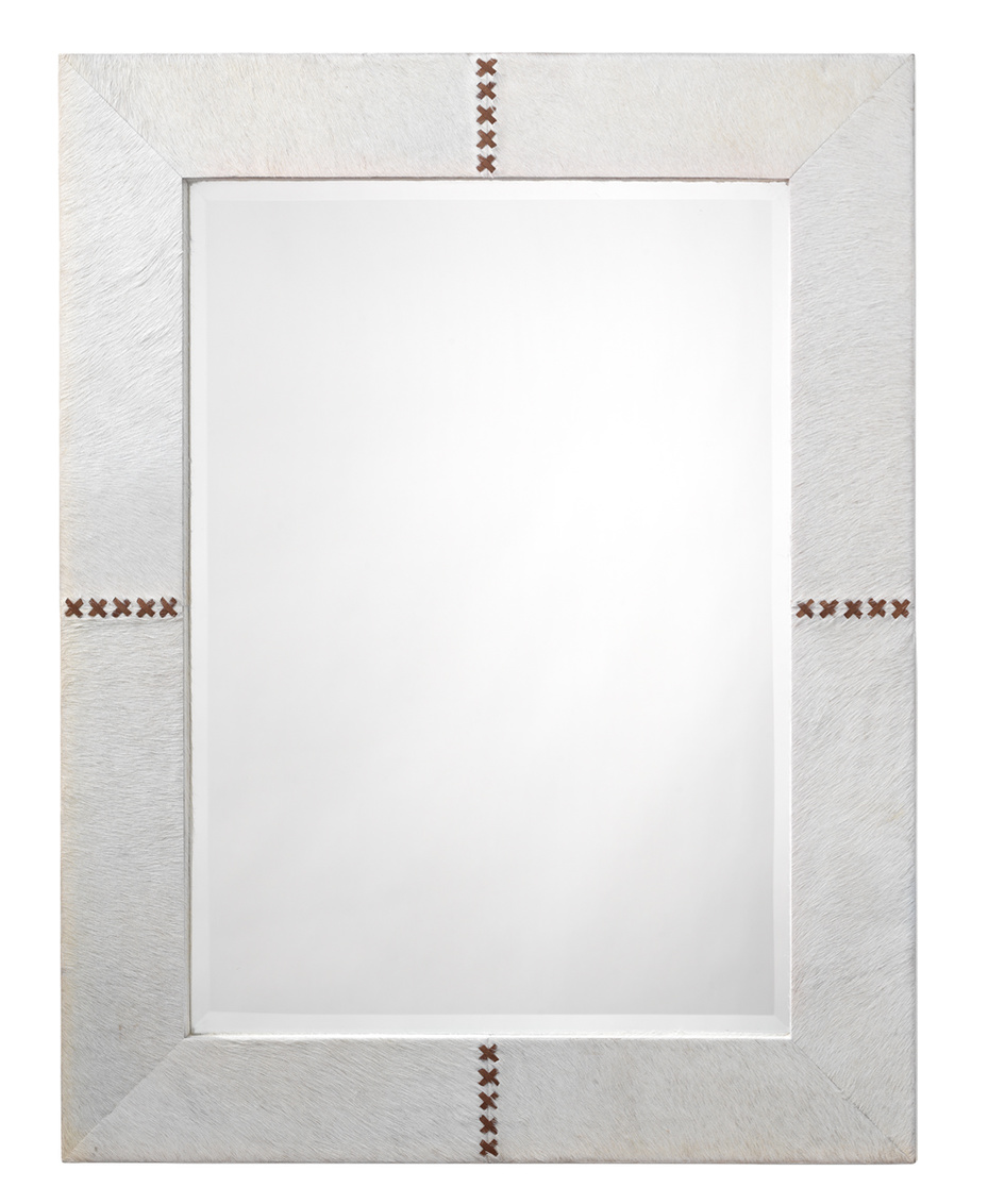 This generously sized beveled wall mirror is edged in hair-on-hide and accented with a contrasting leather cross stich. Available in white or grey, the mirror can be hung horizontally or vertically to suit any decor. Our hides are hand-selected for quality, and small variances in shading may occur.