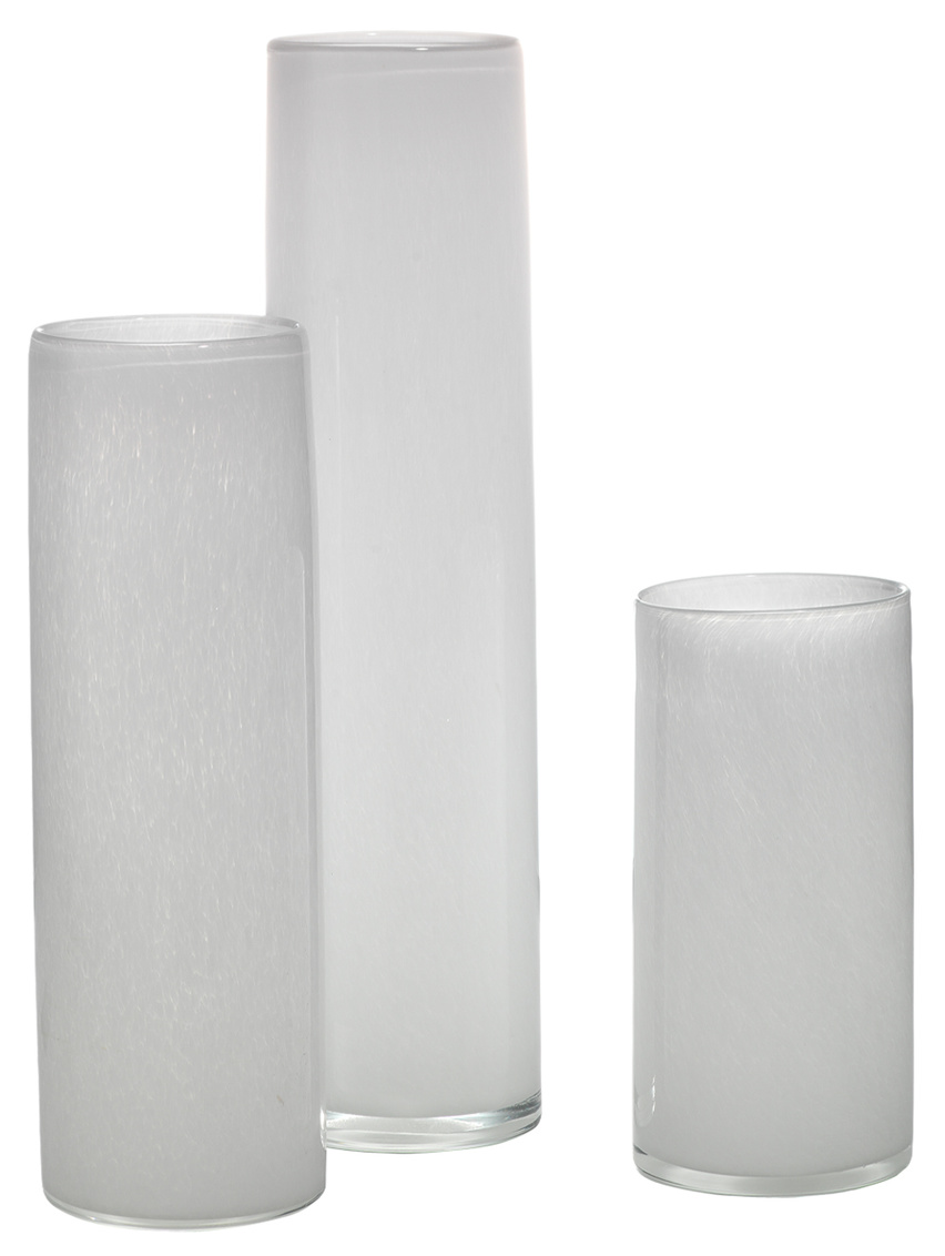 This art glass collection includes three smooth cylinder vases. Each is blown by hand, endowing them with subtle and unique striations and bubbles and enhancing the simple shapes with the organic quality that distinguishes them. Water safe, use with your favorite fresh or faux filler, or simply display.
