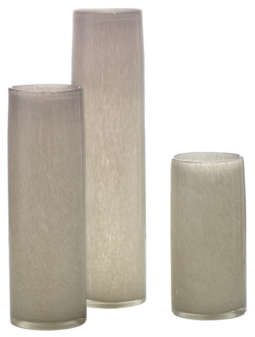 This art glass collection includes three smooth cylinder vases. Each is blown by hand, endowing them with subtle and unique striations and bubbles and enhancing the simple shapes with the organic quality that distinguishes them. Water safe, use with your favorite fresh or faux filler, or simply display.