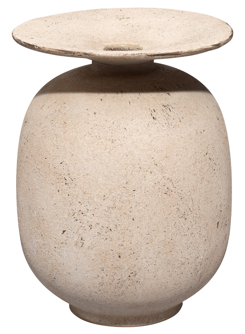 The finish is raw, gently antiqued to mirror the look of a vintage find. The shape is softly rounded, with a narrow neck that flares into an oversized lip. The look is perfection, and easily integrated into nearly any décor style.