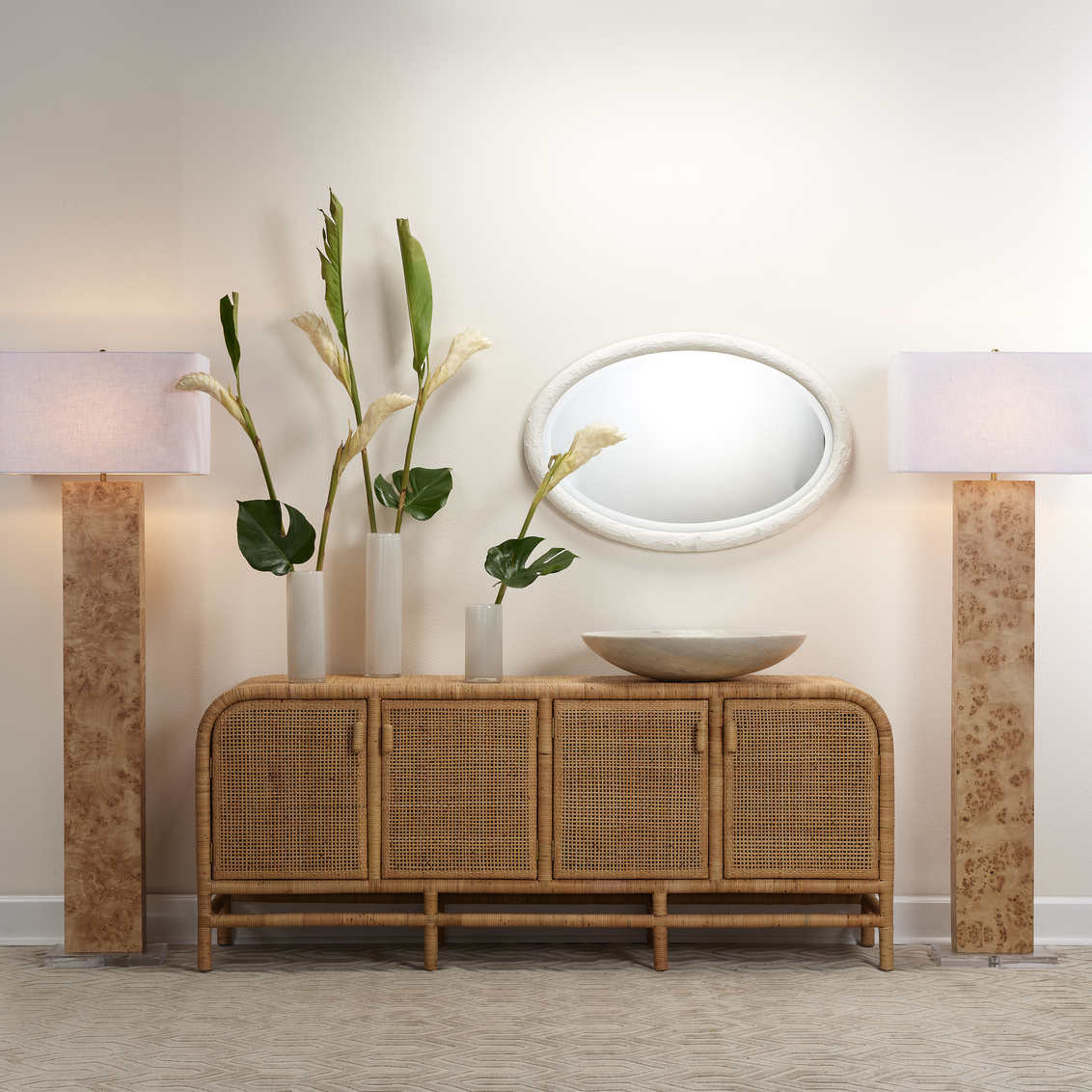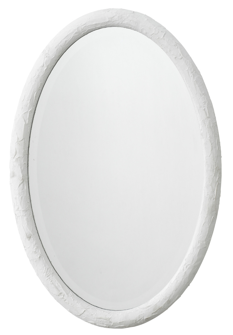 This simple oval wall mirror is enlivened with a richly textured resin frame. The organic patterns created add just the right touch of intrigue keeping the look simple and sleek, and yet still elevated. The Ovation is available in charcoal or white. Each beveled mirror measures three by two feet and can be hung horizontally or vertically to suit your décor.