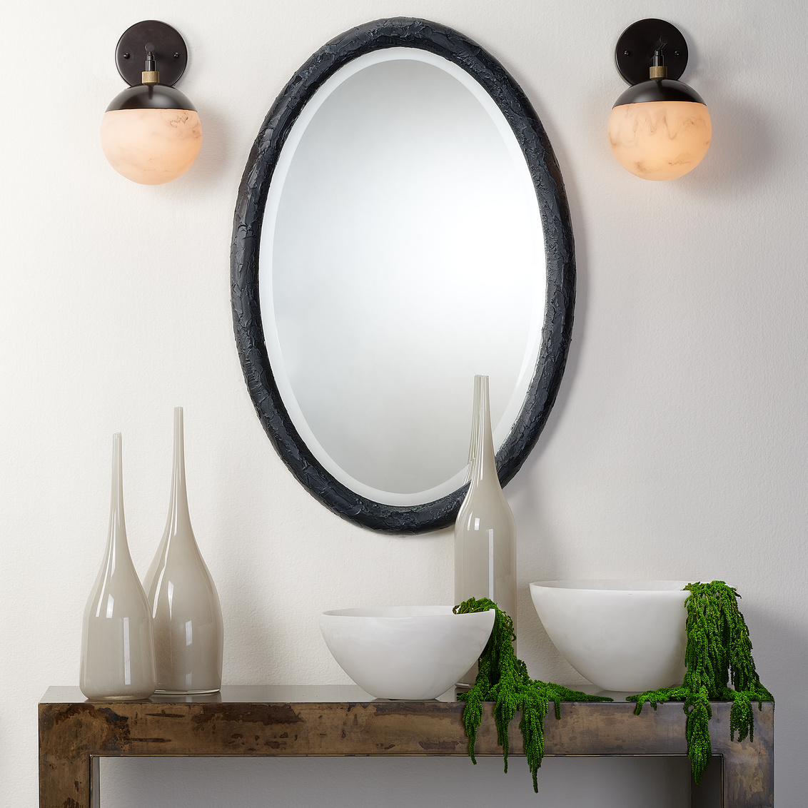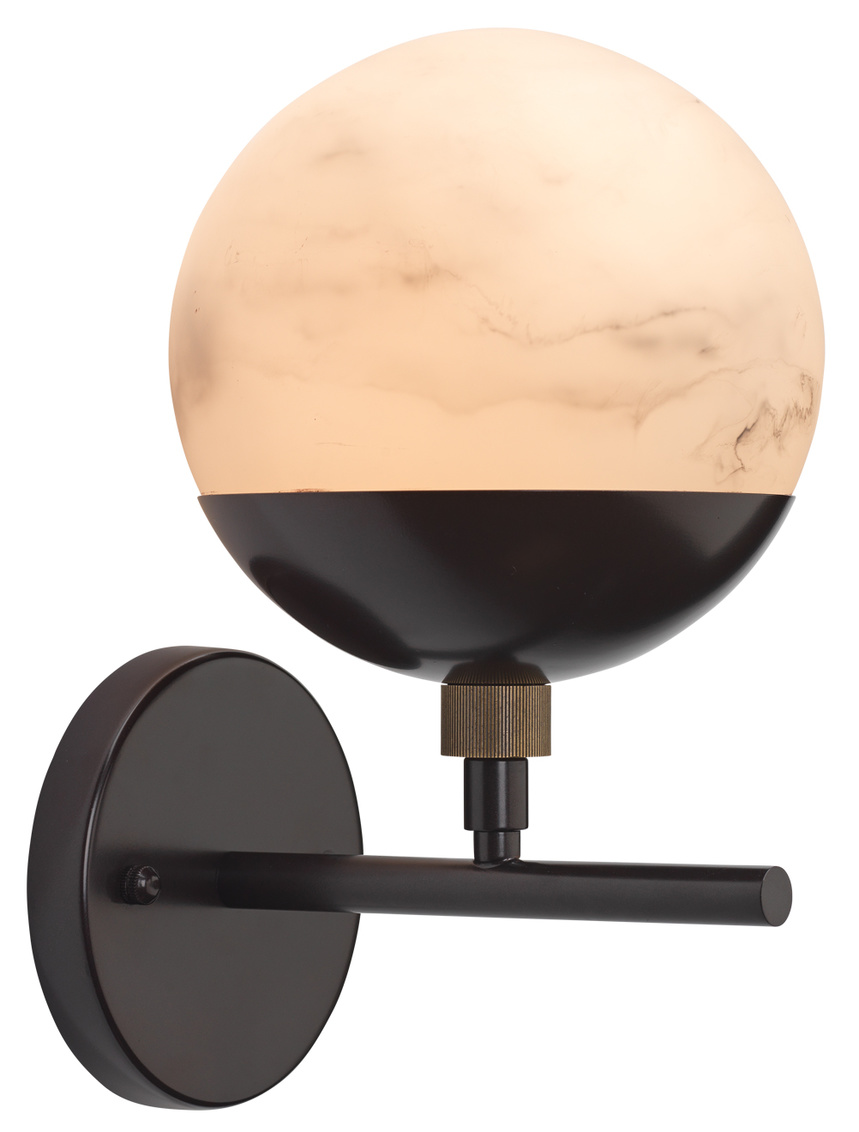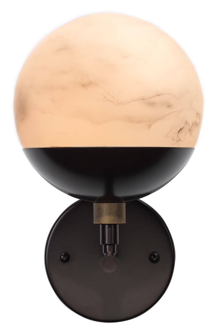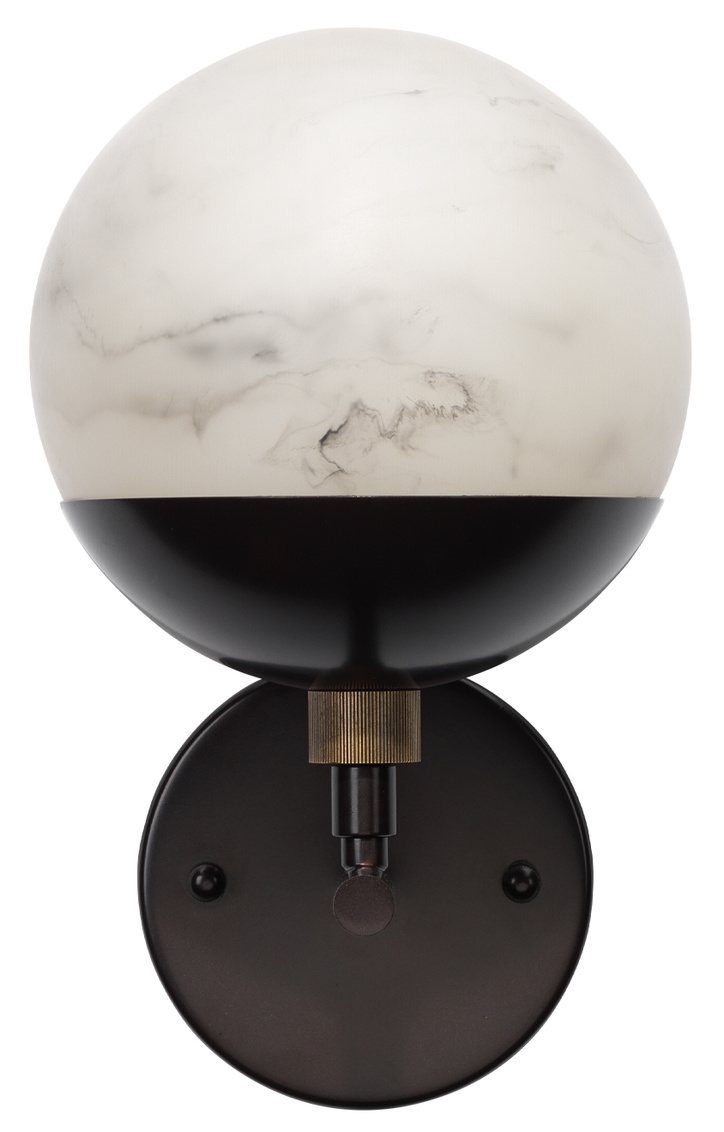 Spherical faux alabaster shades that soften and diffuse the bulbs within are paired with oil rubbed bronze bases and hardware in these sleek sconces from the Metro Collection. Their mid-century inspiration is injected with a decidedly urban zest. The line also includes several striking pendant options! The delicate swirl patterns and veining of natural stone in each shade are recreated carefully by hand from high quality resin and are unique to each piece. Professional installation is recommended.