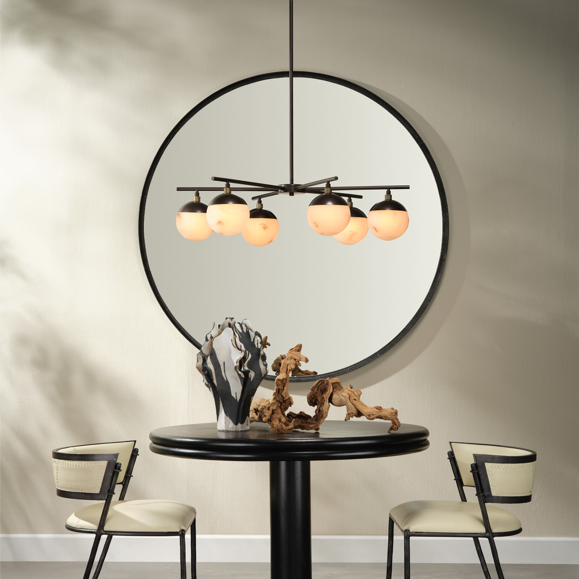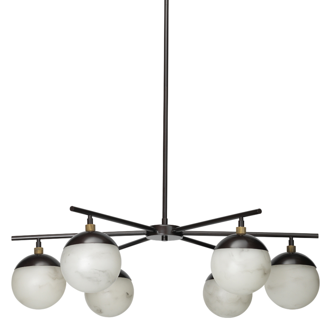 Spherical faux alabaster shades that soften and diffuse the lightbulbs hidden within are paired with oil rubbed bronze bases and... Show more