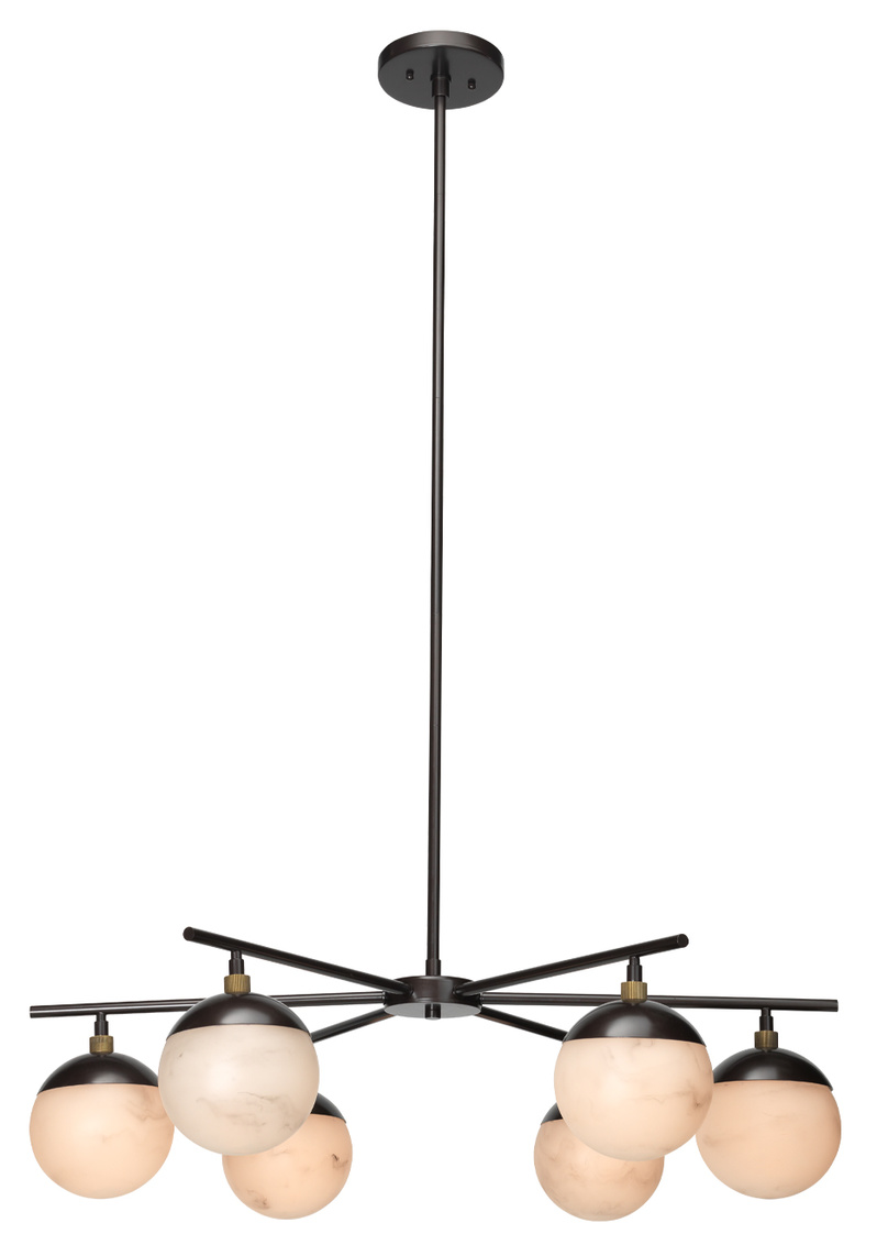 Spherical faux alabaster shades that soften and diffuse the lightbulbs hidden within are paired with oil rubbed bronze bases and hardware in these sleek pendant lamps from the Metro Collection. Their mid-century inspiration is injected with a decidedly urban zest, and they are available in three distinct styles perfect for grouping. The delicate swirl patterns and veining of natural stone in each shade are recreated carefully by hand from high quality resin and are unique to each piece. Professional installation is recommended.