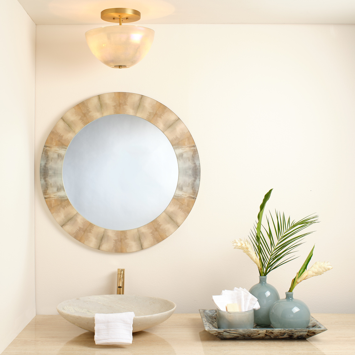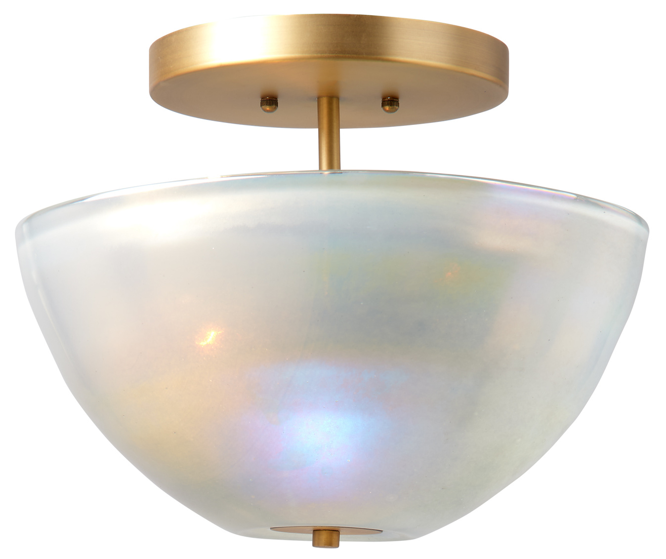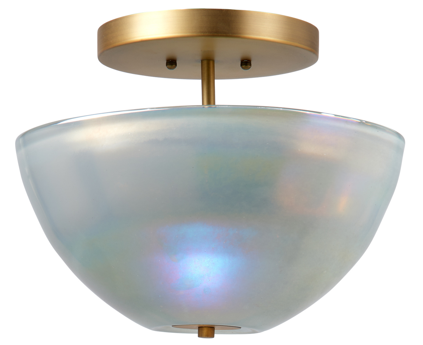 The iridescent opulence of mother-of-pearl has been inspiring artisans for millennia. In the Vapor collection, the subtle beauty of that natural material is recreated in metallic glass. We keep the lines simple, and pair it with burnished antiqued brass hardware to complement and enhance the warmth of the glass. As the handblown pieces are created one at a time, no two will be identical. Each is a unique work of art. Professional installation is recommended.