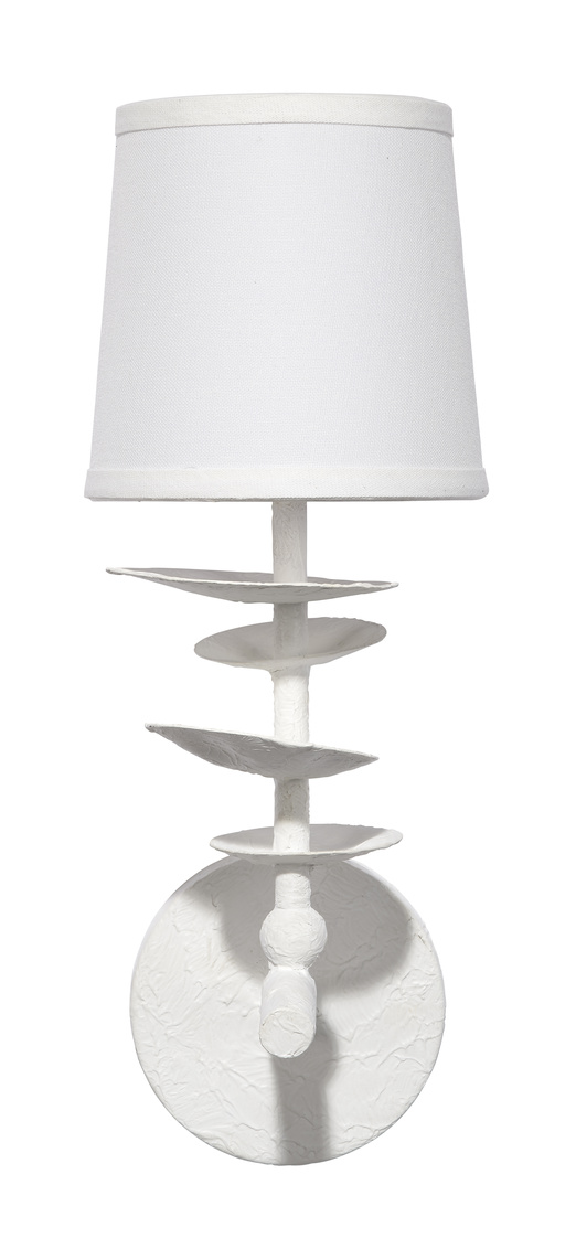 The softness of this wall sconce's organic inspiration contrasts artfully with the unique material our artisans use to handcraft it. The plate, body, and softly curved petals are formed of white cement! It is then given a richly textured finish full of swirls, decorative drip work, and free-form brushstrokes. A tapered white linen shade keeps it clean and bright.