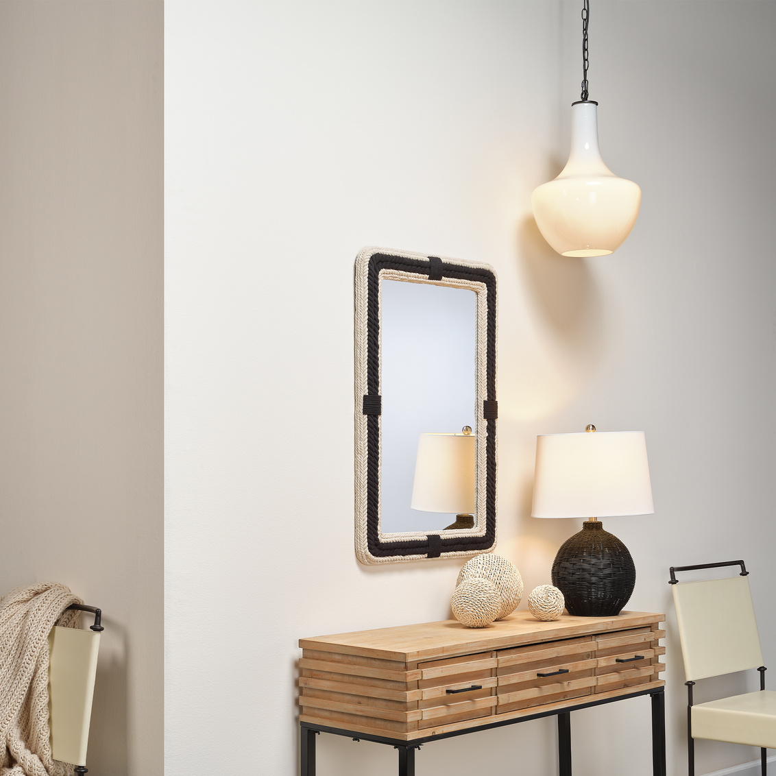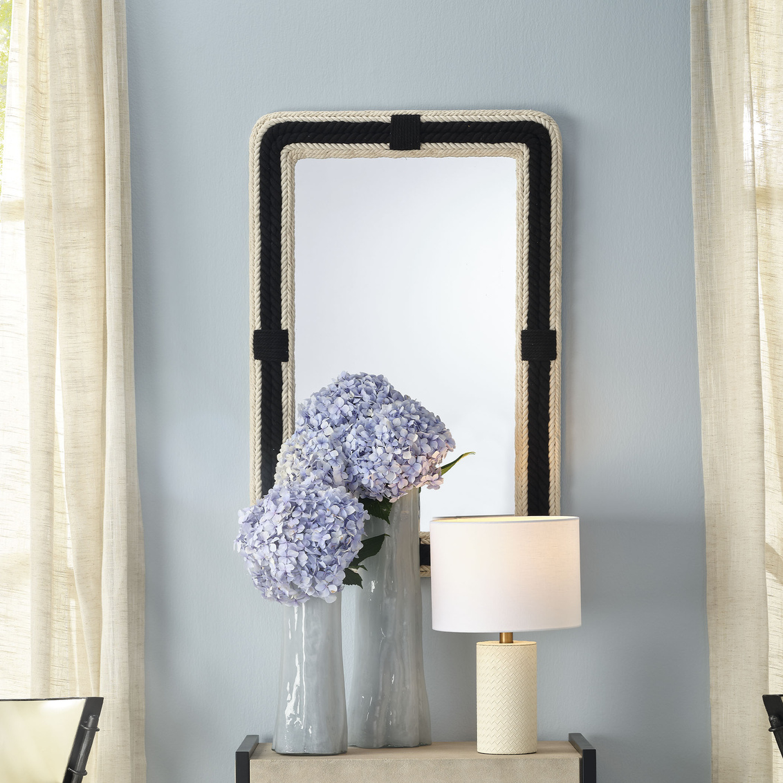 We add a little French chic to a classic nautical look to create this jaunty wall mirror. The frame is intricately braided cotton-jute rope, with rows of black and off-white that contrast stylishly. The finished back has hanging loops that allow it to be displayed horizontally or vertically to suit your interior.