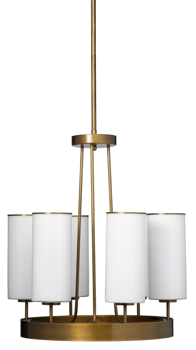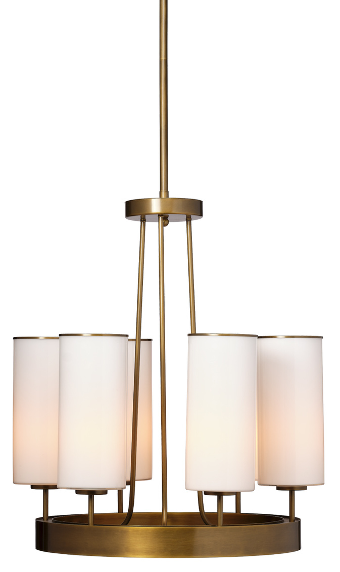 Six opaque white glass cylinders, each artisan handcrafted, float above an antiqued brass base in this sublime chandelier. They create... Show more