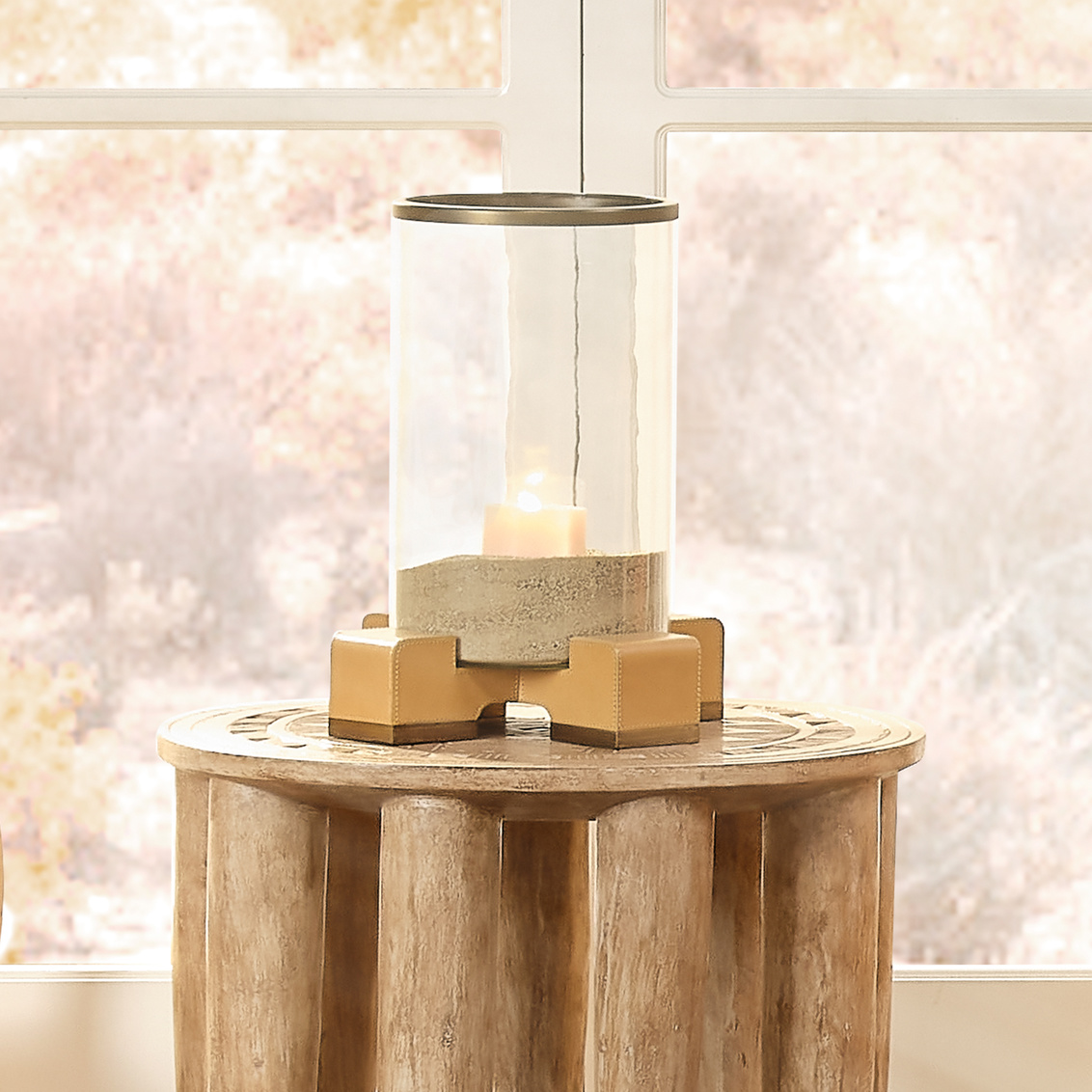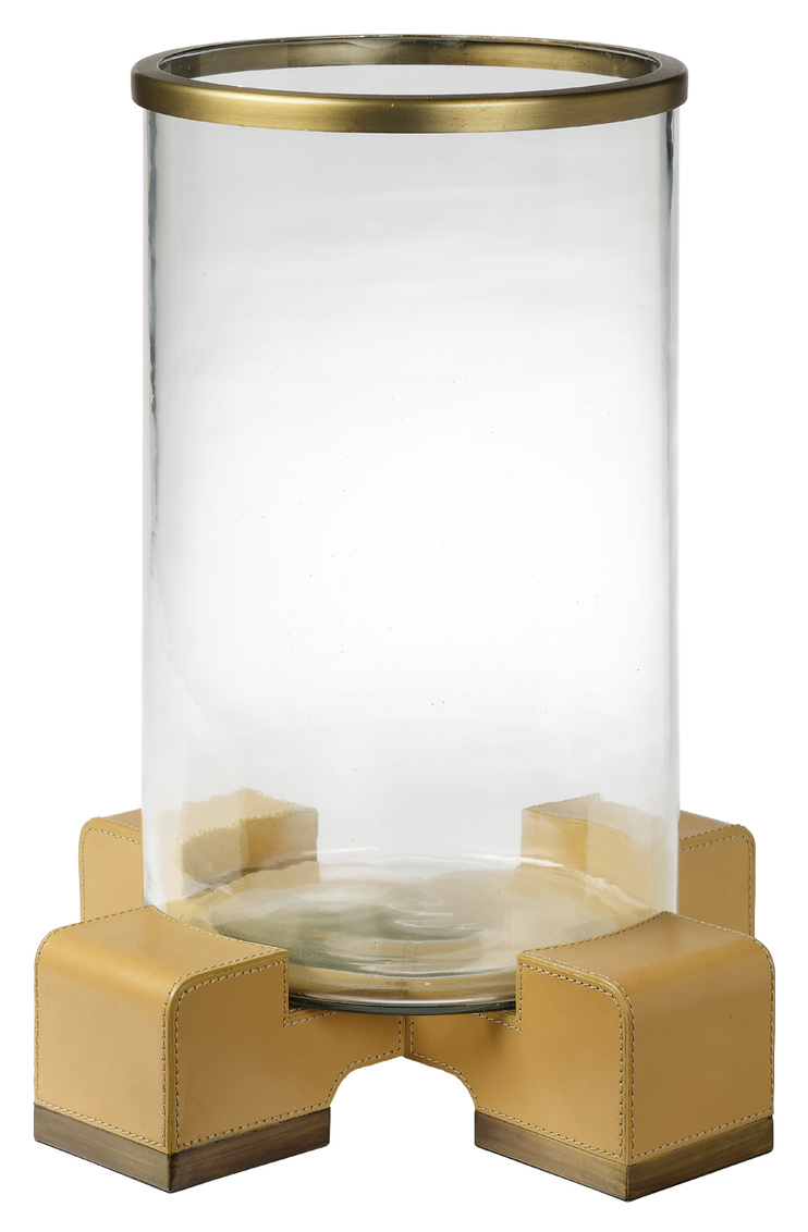 Edgy, elemental materials balance the softness of a candle's glow in this contemporary take on a classic hurricane. A thick cylinder of hand-blown glass protects the candle's fragile flame and is itself supported by a base covered in rich and creamy cashew leather. The top and bottom are banded in burnished brass. Customize the look with your own candle; try an ivory pillar for a monochromatic effect, or use a colored candle to coordinate with your décor.