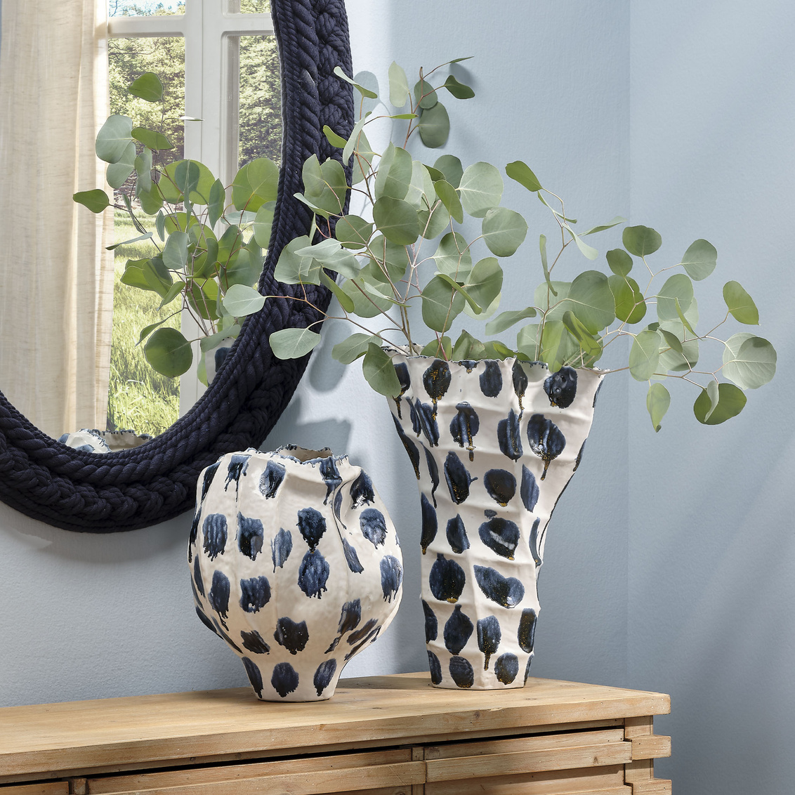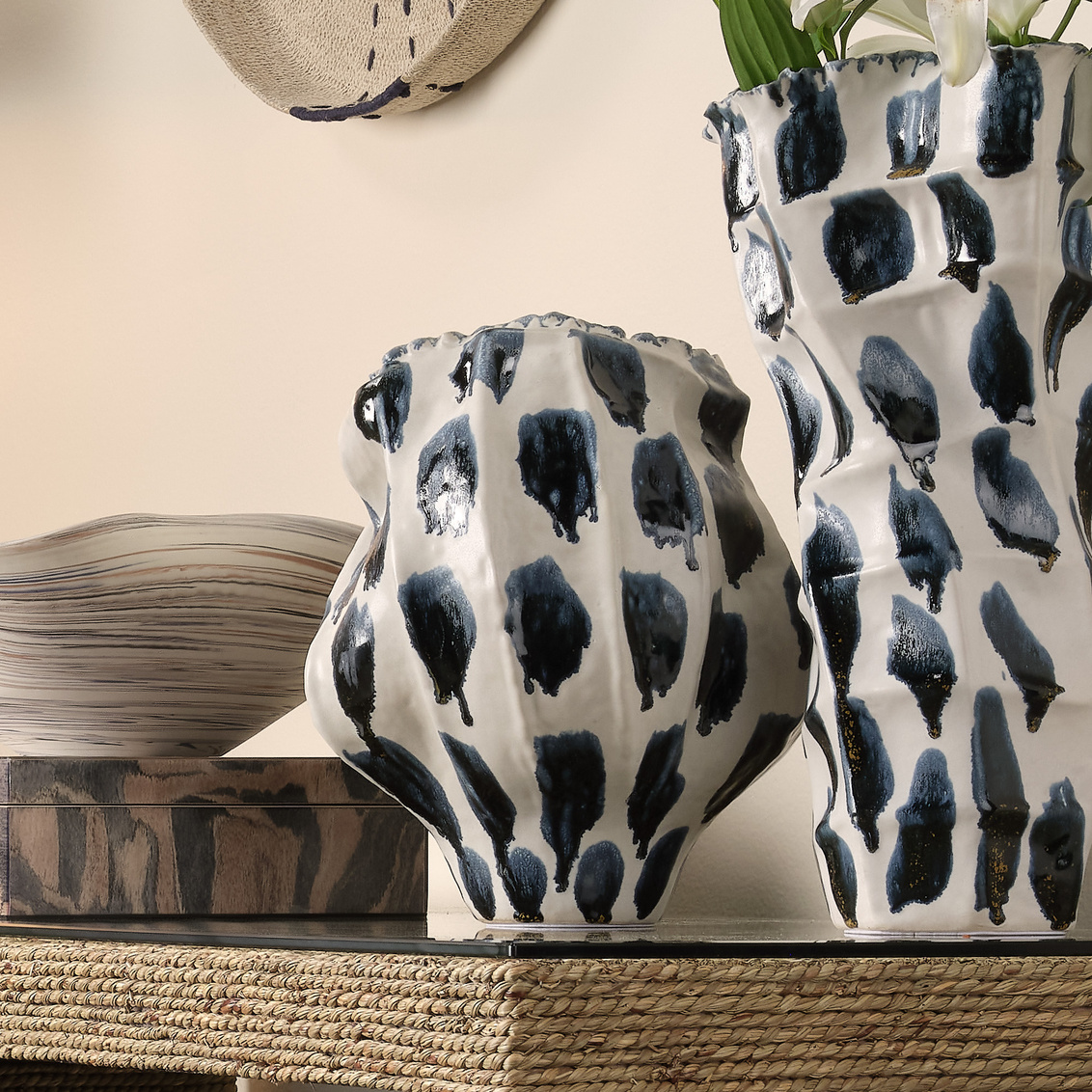 Artfully handcrafted from fine ceramic, these bright and cheerful vessels showcase bold splashes of blue reactive glaze. To accentuate their... Show more