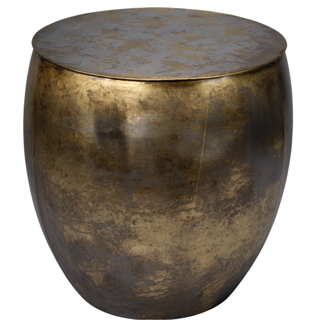 Hand-forged metal finished in antique brass gives this tall drum side table a luminous patina that captures light with subtle radiance. Its sculptural form and layered metallic tones introduce depth and sophistication to any room. Whether styled beside a sofa or as a stand-alone statement, this versatile piece pairs beautifully with warm woods, soft textiles, and rich finishes for a refined, artful look.