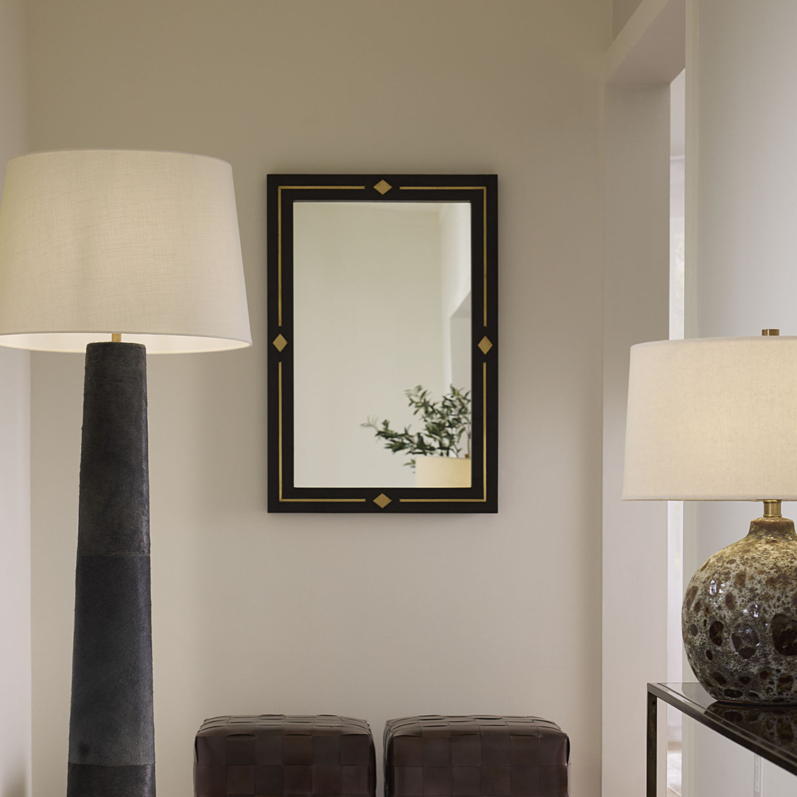 Hand-inlaid brass and warm mango wood unite in this elegant mirror, creating a luminous interplay of texture, tone, and geometry.... Show more