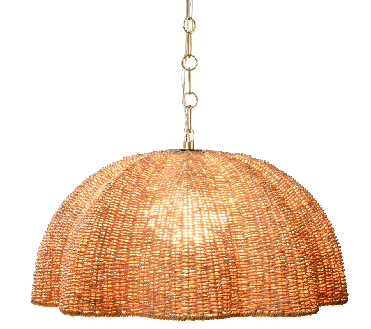 Natural palm leaf is expertly artisan-woven and shaped into a pendant reminiscent of an oversized bloom in this light, airy pendant lamp. Inside the seagrass shade is a large hand-blown glass globe that additionally diffuses the light. The custom chains and canopy are in gently burnished brass. A casually beautiful choice for above a breakfast bar or a kitchen island.