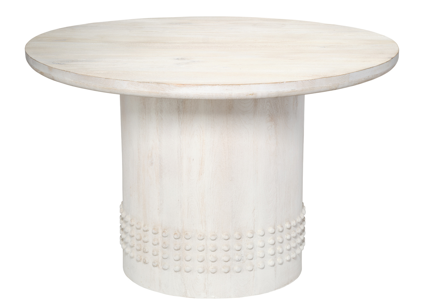 Artisans craft these sand-blasted mango wood tables with a white-washed finish that brightens and softens the wood’s natural elegance. The round tabletops rest on column bases accented with a band of textural dots. Each piece is built to last and designed to last. These tables combine approachable style, warmth, and functionality, providing an elegant yet casual accent that integrates seamlessly into relaxed, comfortable home décor.