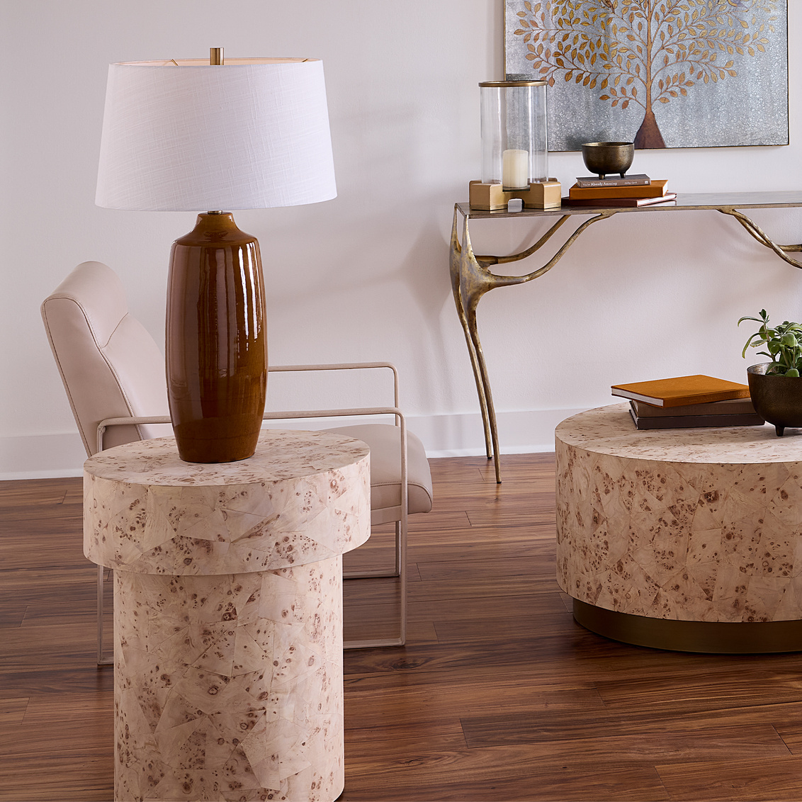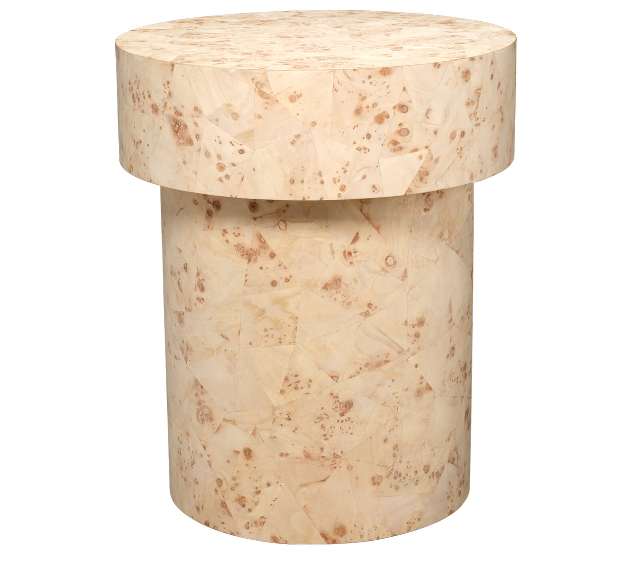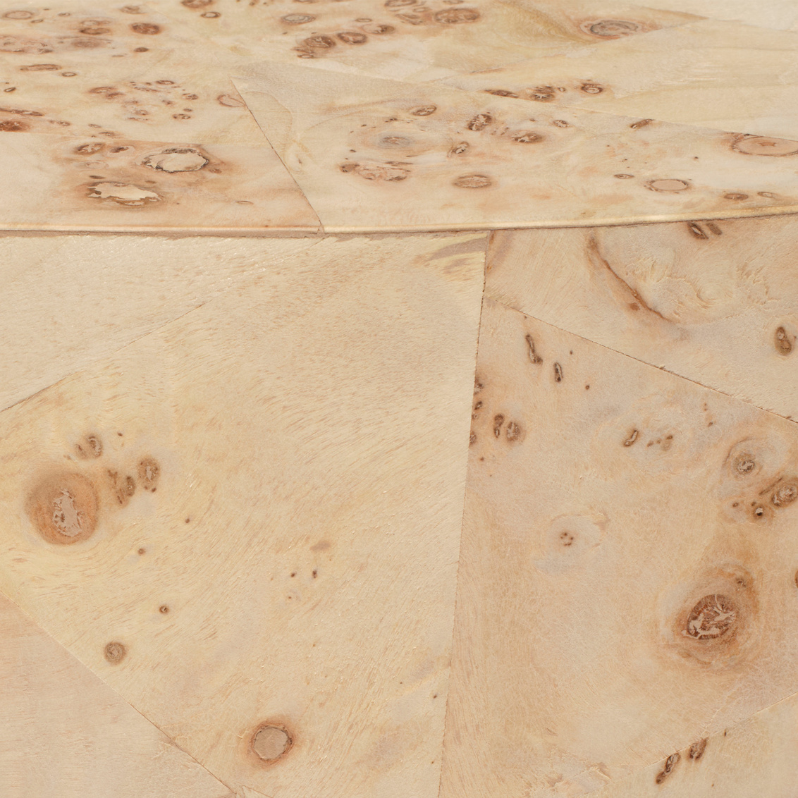 Artisans mosaic small pieces of bleached burl wood veneer together to create this unique side table, showcasing the natural depth and intricate pattern of the wood. This one-of-a-kind, artisan-crafted piece combines beauty and durability. Its warm neutral colors, clean lines, and elegant proportions allow it to complement a variety of décor styles while refreshing and elevating any interior space with timeless charm.