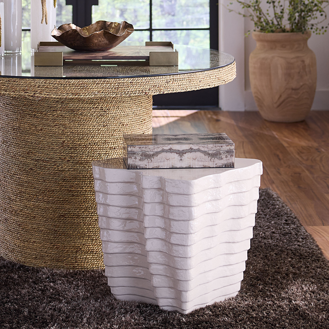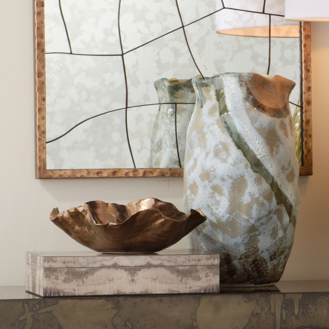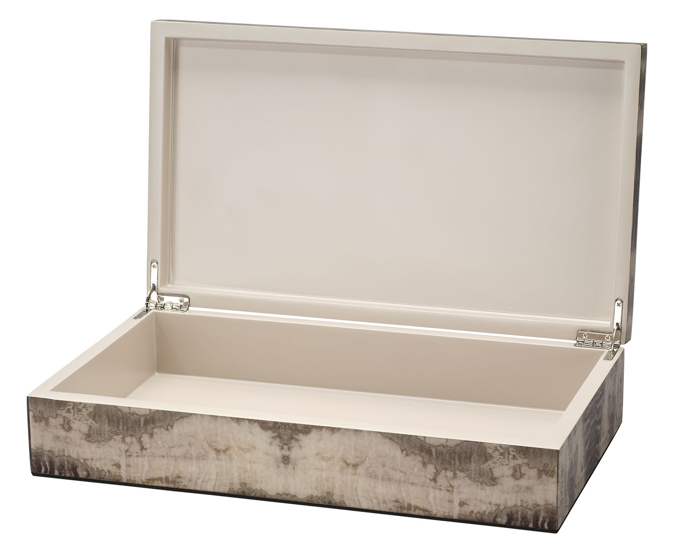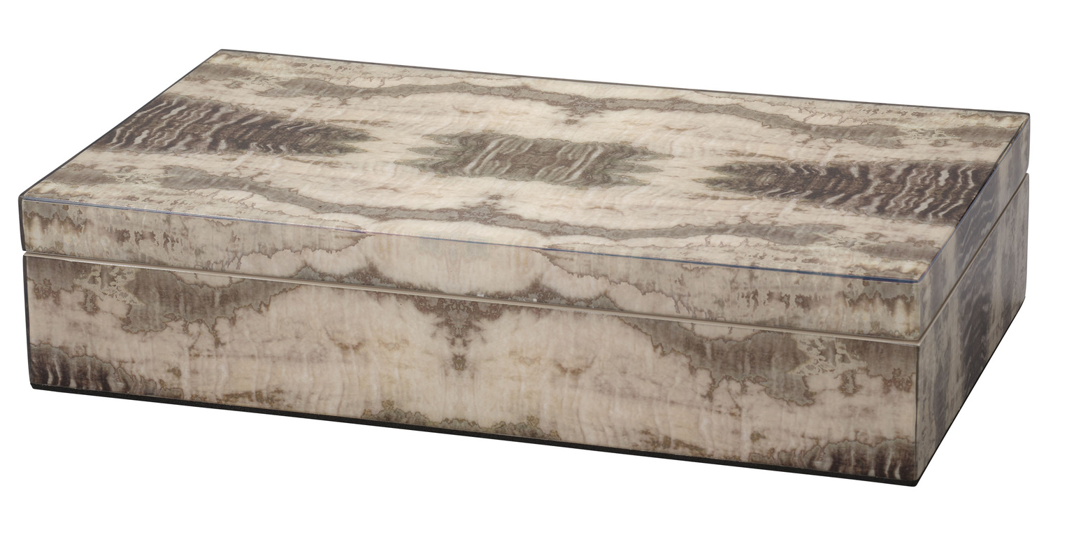 The serpentine-like patterns in gray and cream that embellish the exterior of this box are, like fine couture garments, elegantly and beautifully finished on all sides. Artisans cover the box with layers of hand-applied lacquer and attach strong metal hinges, allowing it to open easily and provide ample storage for small treasures like watches or jewelry, or stylishly stash necessities from remotes to charging cords.