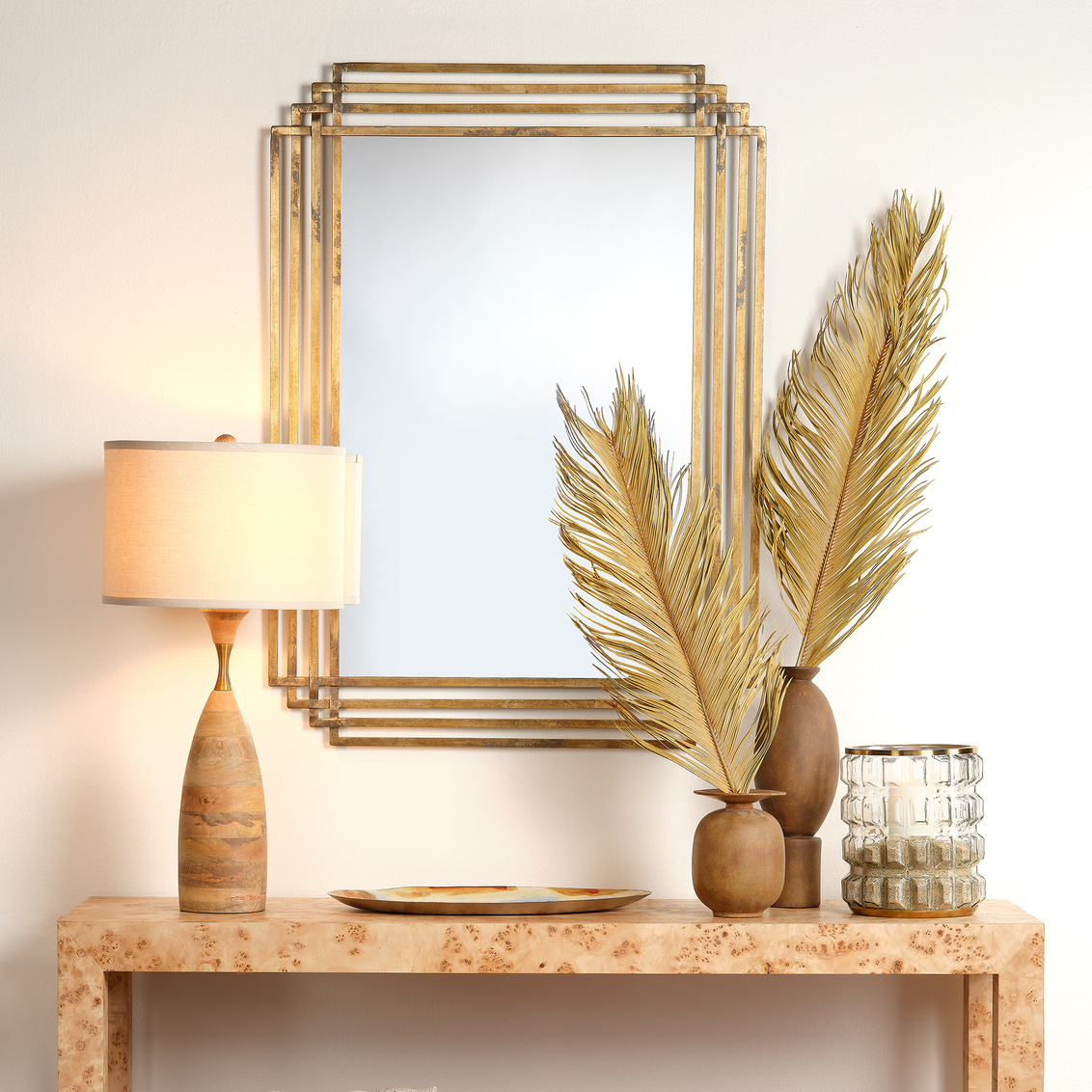 Our Serai Mirror embodies both modern and traditional design with a streamlined frame in a hand worked antique brass finish.