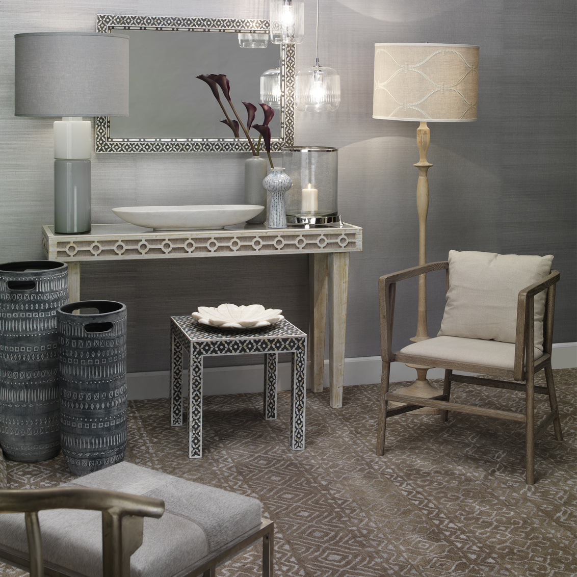 Mother of Pearl inlayed in an exquisite design for an exotically graceful accent to any room in a beautiful grey... Show more